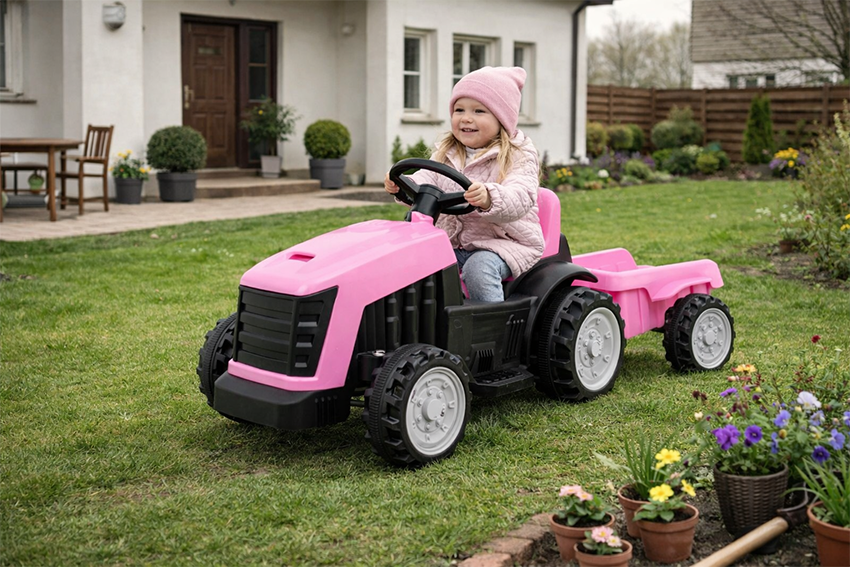 Traktor z Przyczepą Różowy to propozycja dla maluszków od około 2. roku życia. Silnik 25W, akumulator 6V/4,5Ah i przede wszystkim pojemna różowa przyczepa do przewożenia zabawek sprawiają, że ten pojazd rozbudza wyobraźnię w szczególny sposób. Dla dziewczynki, która lubi wcielać się w różne role, traktorek z przyczepą daje nieograniczone możliwości zabawy: można przewozić kamienie, liście, pluszaki i wszystko, co dziecięca wyobraźnia uzna za godne transportu.